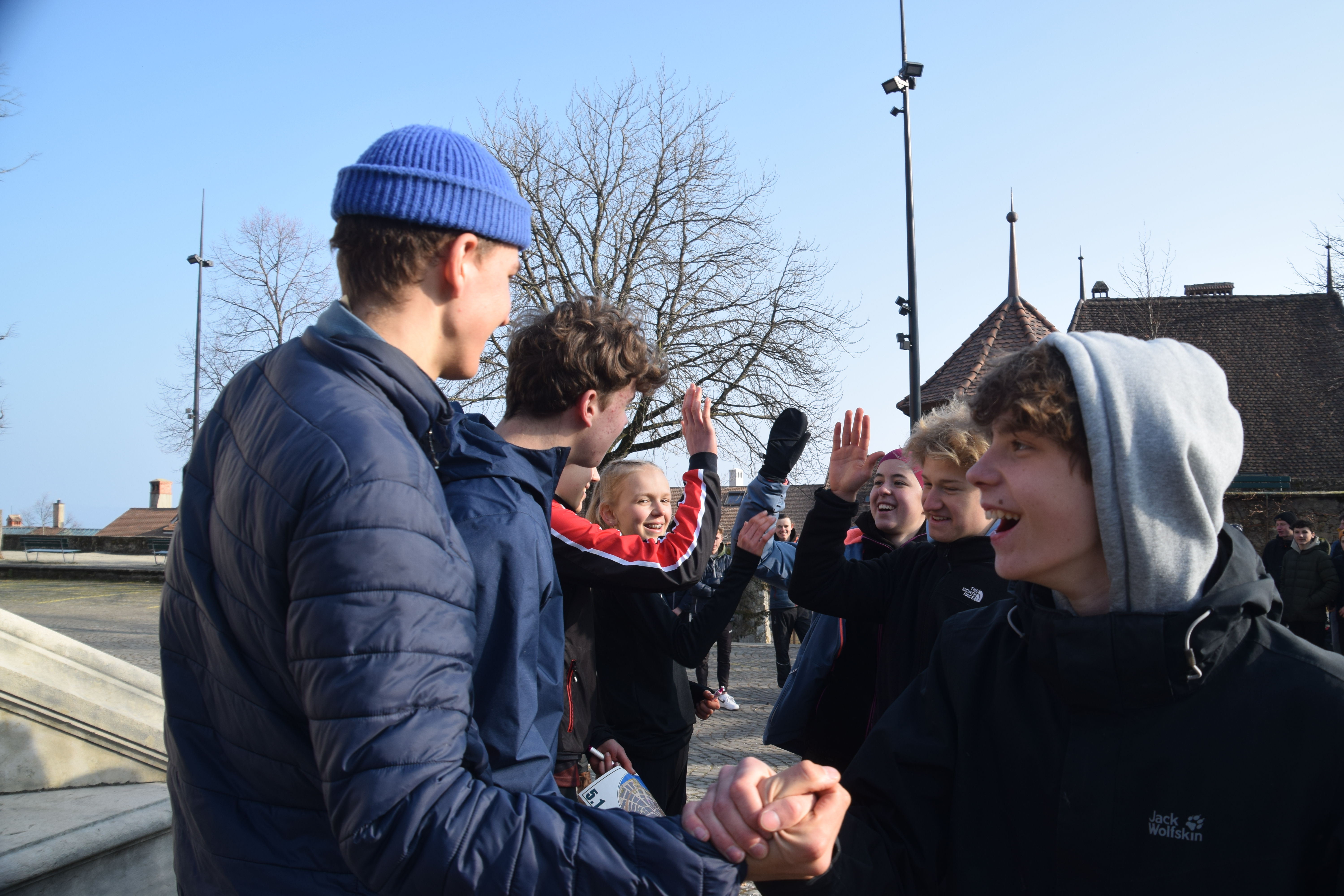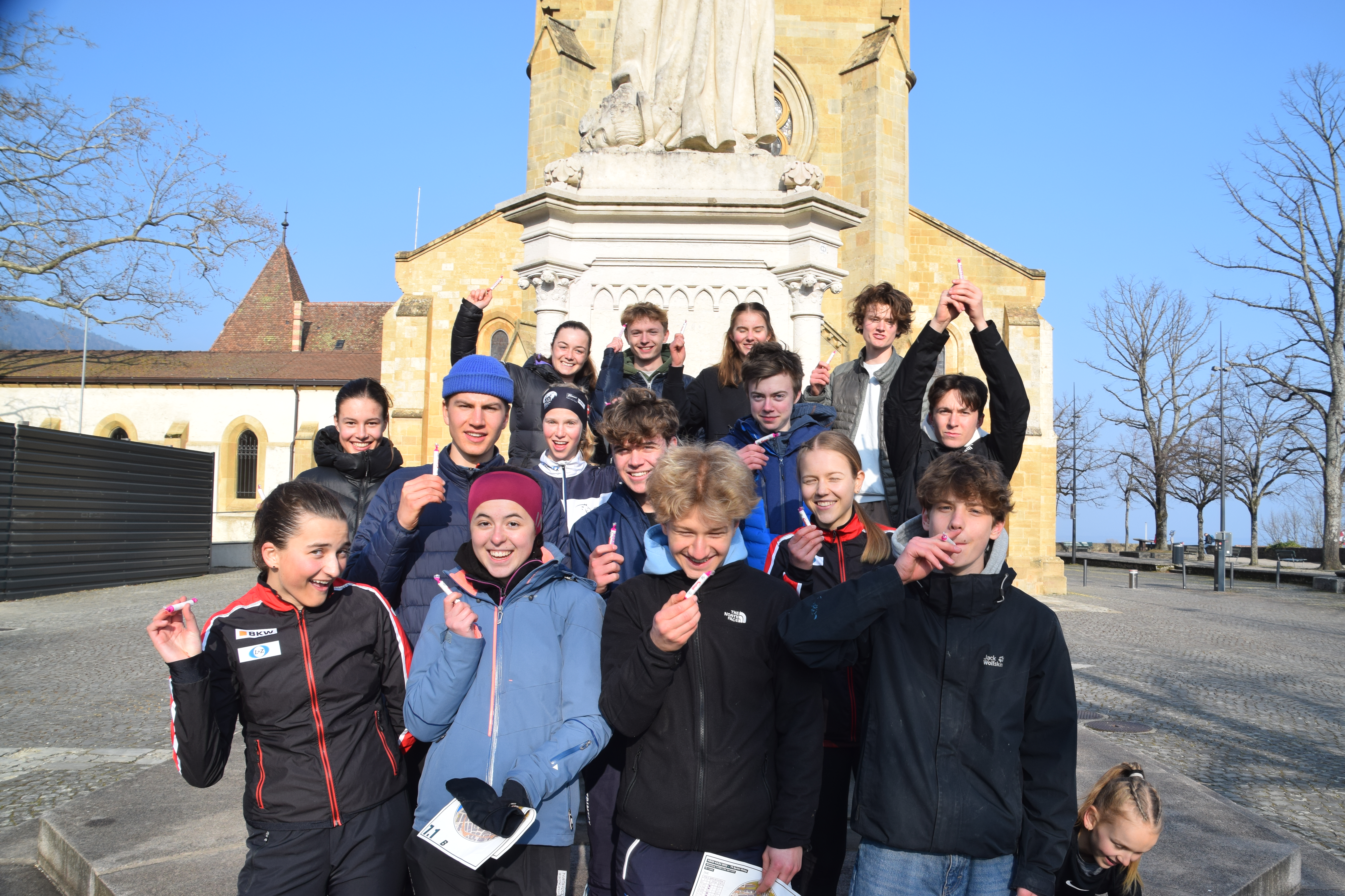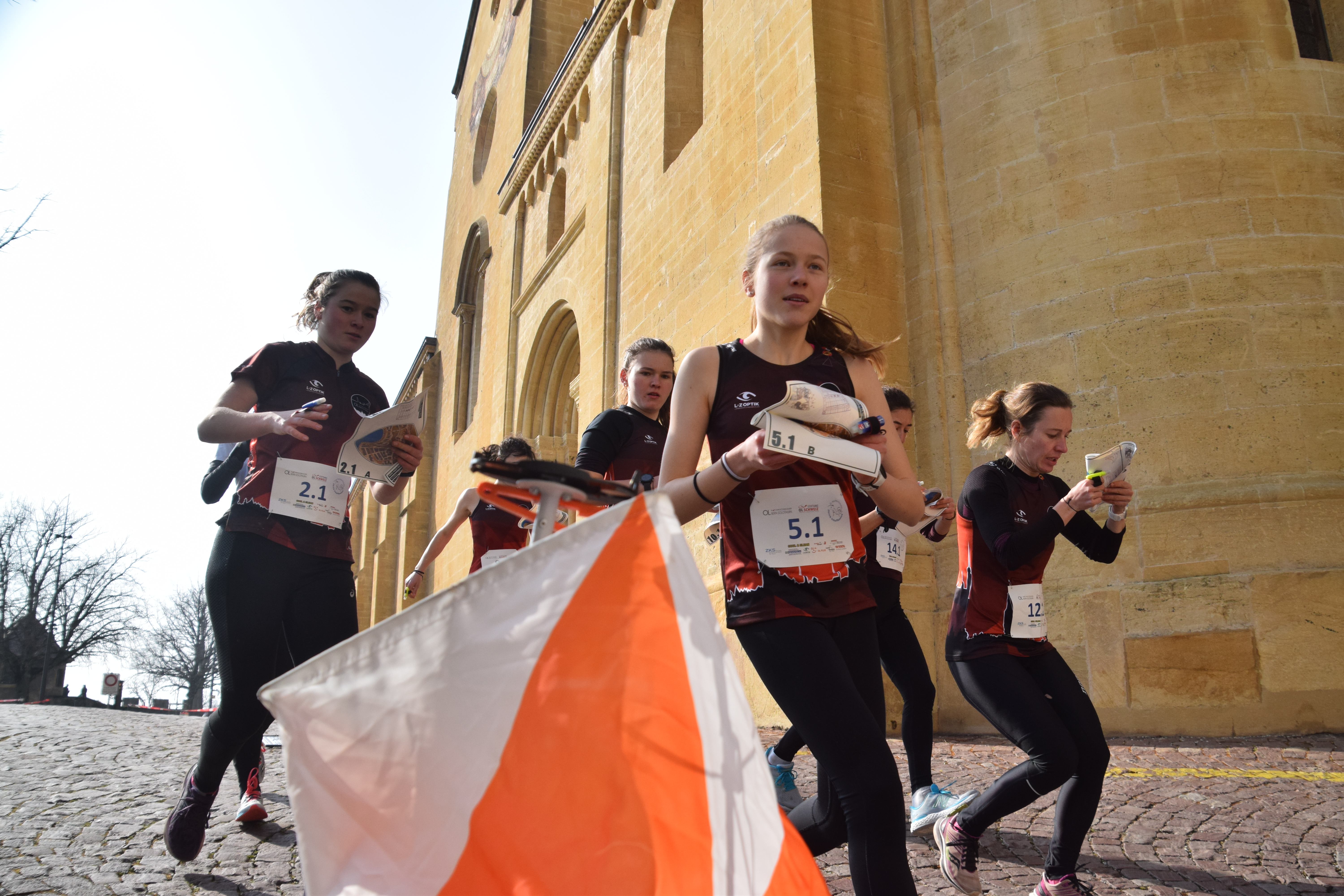 Nach diesem langen, aber guten, Training assen wir gemütlich Mittag und unterhielten uns mit den Soubären. Danach hiess es in die Busse steigen und Abfahrt nach Neuenburg. in die Stadt, wo die abschliessende Sprint-Staffel mit durchmischten Teams des Zürcher und Berner Kaders stattfinden würde. Die Vorfreude war da, doch die Erschöpfung nach den vier vorherigen Trainings war zu spüren. Dort angekommen nahmen wir unsere Taschen und liefen vom Parkplatz durch halb Neuenburg auf den Hügel der Burg. Dort zogen wir uns schon bald um, vor allem die Läufer der Startstrecke mussten sich beeilen. Da ein paar Athleten ihre Ausrüstung vergessen hatten, wurden verschiedenste Outfits zusammengestellt mit Badehosen und Kleidern von anderen Athleten. Um 14:30 Uhr fand der Massenstart statt.